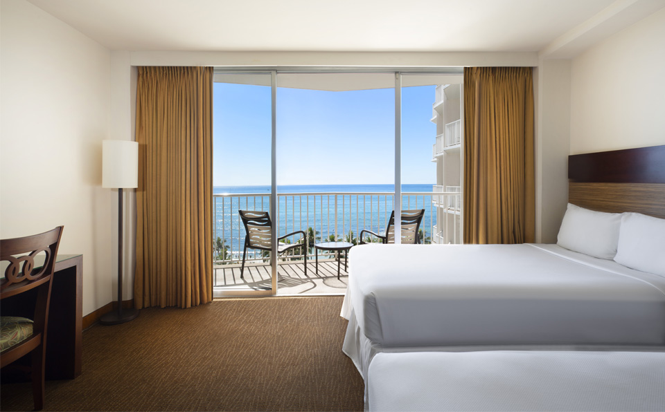 お部屋の外を眺めると、そこは碧い海。息を飲むほど美しい太平洋の景色をお楽しみいただけるお部屋です。プライベートラナイから眺めるワイキキのサンライズとサンセットをご堪能いただけます。 ベッドタイプはキングベッド1台、またはダブルベッド2台、いずれかをご選択いただけます。