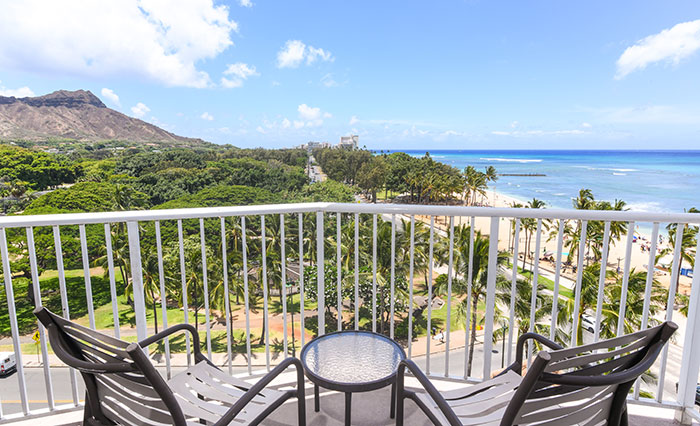 プールサイドルームを除く全客室にプライベートバルコニーがございます。椅子にゆったりと腰を掛け、目の前に碧い海が広がるオーシャンフロントビューから雄大なダイヤモンドヘッドビューまで、ハワイの美しい景色をお楽しみください。